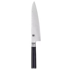 The chef’s knife is an all-purpose knife used for slicing, chopping, dicing, mincing, and many other functions. The blade is curved to allow the cook to rock the knife on the cutting board for a more precise cut.