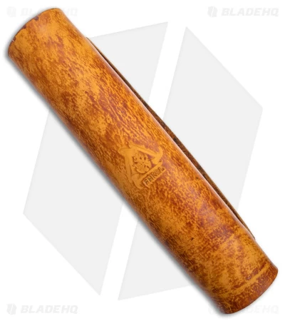 Fire Hall Knife’s leather tray has a dark tan finish with brass snap clasps.
