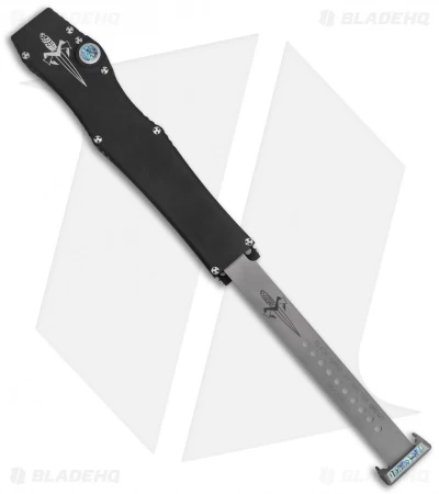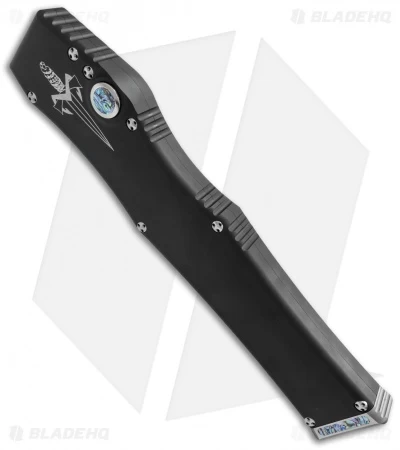 This HALO V 3X has a remarkable Walter Brend hand ground tanto blade with a mirror polished finish. The handle is black anodized aluminum with the Marfione Dagger up front. Abalone inserts on the firing button and draw bar add a very fine touch to this giant knife.