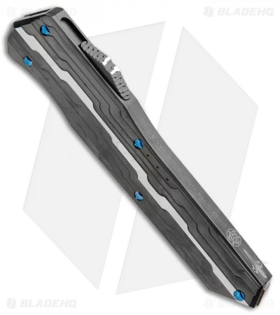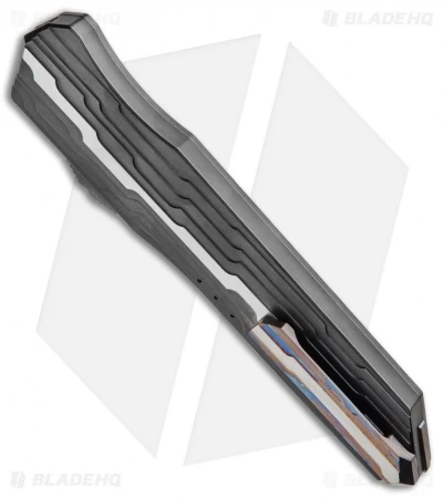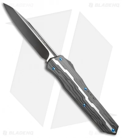 The Cypher OTF is an A. Marfione / D.C. Munroe collaboration featuring exceptional custom detailing and precision craftsmanship. This model is equipped with a single-edged blade in a two-tone DLC mirror/satin finish. Its stylized handle is made from RoyAlloy stainless steel with a two-tone Vapor Blast DLC finish. The knife comes equipped with a MokuTi/Satin pocket clip and blue anodized hardware.