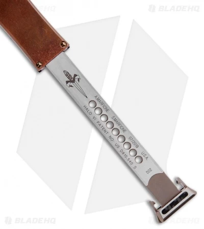 This Marfione custom Halo VI has a Hellhound Tanto blade with a mirror polished finish. Its handle is made from Mil-Spec anodized alloy and copper with bronze titanium hardware, and has no integrated safety on the push button. The charging handle comes marked with the Marfione Dagger and date of creation.