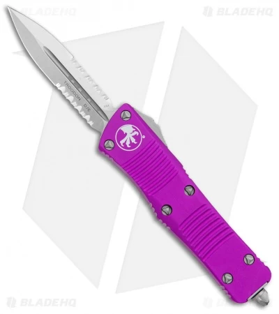 This Troodon has a stonewash finished dagger style blade with a partially serrated edges. The handle is violet anodized aluminum with bead blast finished hardware, pocket clip and glass breaker tip.