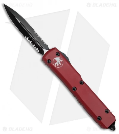 This Ultratech features a double-edged dagger blade with a black finish and partially serrated edges. It has a contoured, red anodized 6061-T6 aluminum handle with a black finished pocket clip, glass breaker, and stainless steel hardware.