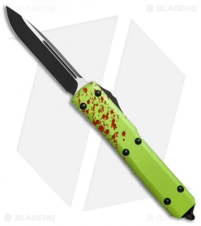 This Zombietech model has a black drop point blade with a plain edge. The Zombietech is a variation of the Ultratech with a random blood spatter over the green anodized 6061-T6 aluminum handle. It has tactical black finished pocket clip, glass breaker and stainless steel hardware.