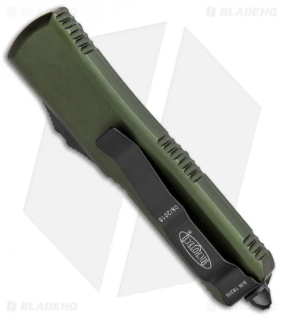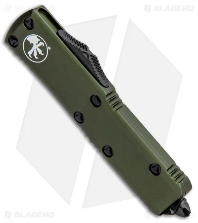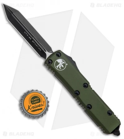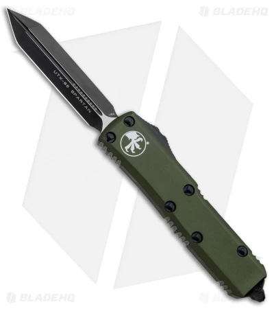 This UTX-85 model has a black finished Spartan blade with plain edges. The 6061-T6 aluminum handle is OD green anodized and outfitted with black hardware, pocket clip, and glass breaker tip.