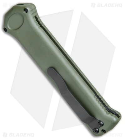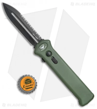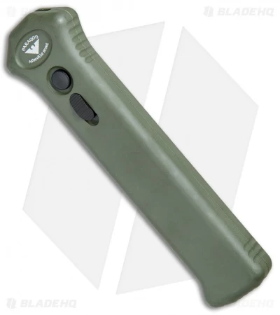 This PARA-XD has a black finished double-edged dagger blade with a serrated top edge. The smooth, contoured handle is OD green Cerakote coated 6061-T6 aluminum with a sliding safety and tip-down pocket clip.