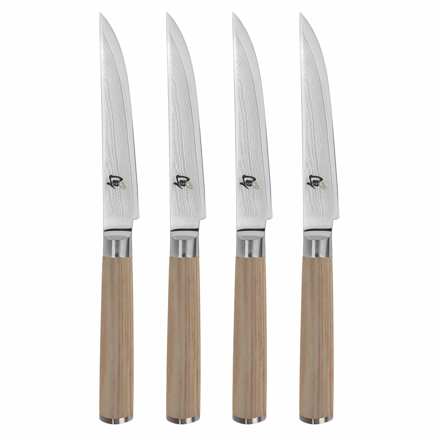 The right steak knife can make a good steak taste even better. The key is in keeping more of the flavorful juices inside the steak. A razor-sharp knife, like the Shun Classic Blonde Steak Knife, will glide through the meat, cutting fewer of the capillaries in the steak and keeping more of the flavor inside, where it belongs. This set of four beautiful Shun Classic Blonde Steak Knives are a perfect length; long enough to handle even the largest steak, yet short enough to provide excellent cutting control. This four-piece set is ideal for a small dinner party. The Shun Classic Blonde Steak Knife Set comes in an elegant box, perfect for gift giving or storage.