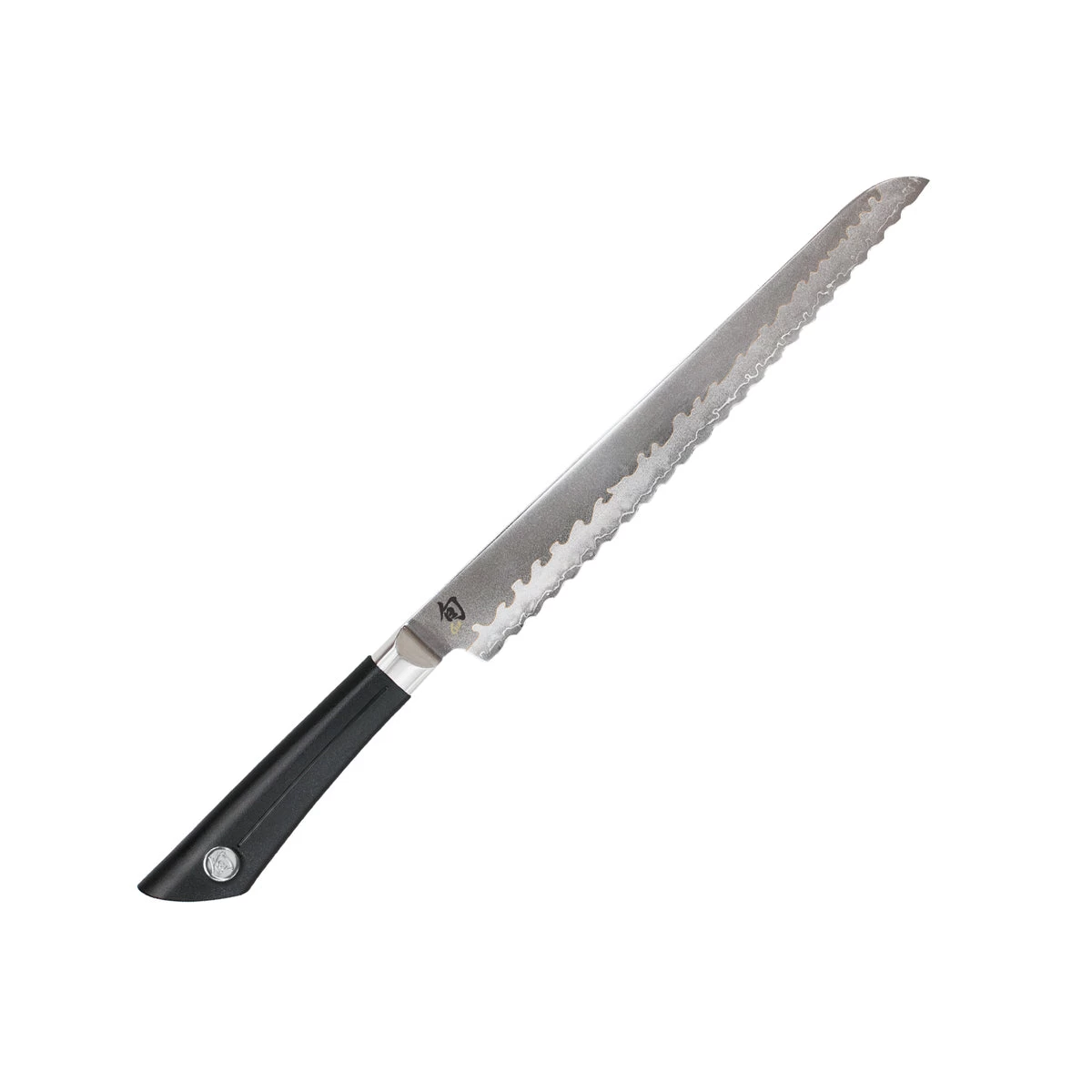 Prepare to fall in love with this bread knife. Whether you prefer a rustic, crusty bread or a soft and tender loaf, the Shun Sora Bread Knife will cut through easily to give you the perfect slice of bread every time. What makes this bread knife special—and better—is the way Shun has crafted the serrations. These aren’t jagged little teeth that chew through your bread. These are razor-sharp “low-frequency” serrations. These wider serrations glide through the bread with ease. What’s more, cutting is even smoother because Shun has designed the serrations so that there’s an equal amount of cutting power on the forward stroke and on the back stroke. Look at the blade and you’ll see that the serrations lean forward on the front of the blade and backward on the back of the blade. That small change makes a big difference in cutting ease. The Shun Sora Bread Knife is part of the exciting Shun Sora line that provides exceptional handcrafted Shun quality at an amazing price. Sora uses Shun’s proprietary Composite Blade technology to bring together a VG10 san mai cutting edge with a Japanese 420J stainless steel upper. This technology puts high-performance material exactly where it’s needed—on the edge. The two blade sections are laser cut, then fit together like pieces of a jigsaw puzzle. Braze welding permanently joins them. The attractive wavy pattern at the joint is based on traditional Japanese sword hamon lines. While Sora’s blade shapes and handle design are traditional Japanese, the textured PP/TPE polymer blend handle material provides a contemporary look, secure grip and balance, and is easy to maintain.