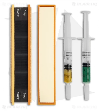 Two dual-sided leather strops and two syringes containing 3.5 & 5 micron paste. Removes fine scratches and creates a very sharp edge.